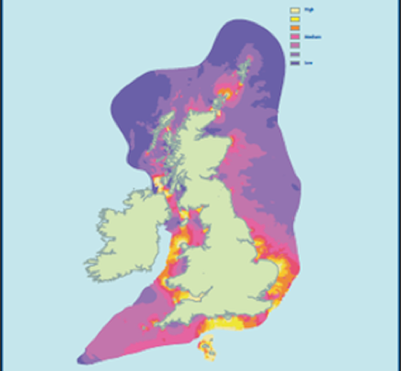 The total UK resource if the best locations with fast-running currents were utilized is estimated to be 18 TWh in the year, for which about 6 GW of installed capacity would be required. The best locations are shown on the map. However, if all possibilities were exploited, 94 TWh in the year is estimated.