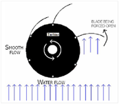 A device for extracting power from a flowing stream has been proposed and patented. The device has a vertical axis and can respond equally to flow from any direction, so that no yawing mechanism is required. This simplicity is a key feature. A number of blades are attached by hinges to a central drum. During rotation, the blades open when the flow exerts a net positive pressure on them. They then drive the rotor around until the relative motion closes them again, after which they present little resistance while completing the rotation.